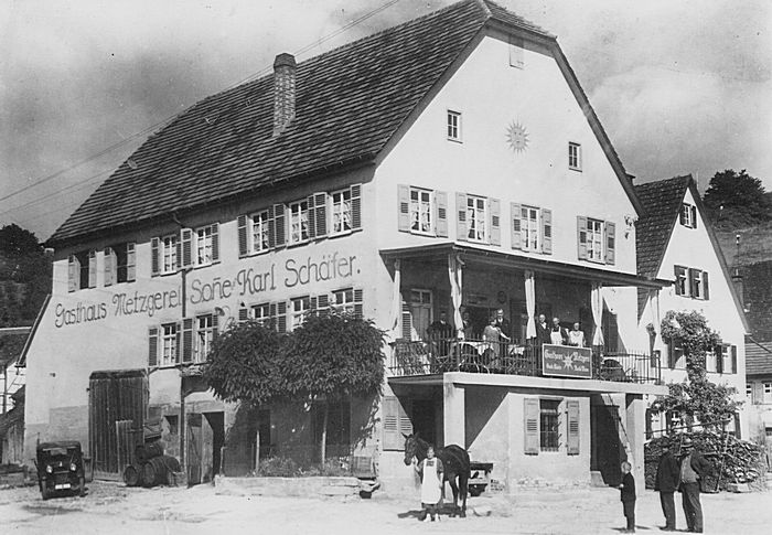 ca. 1930. Vordere Seestrasse, Gasthaus Metzgerei Sonne. Dahinter das Haus von Jakob Müller, Oberholzmacher.