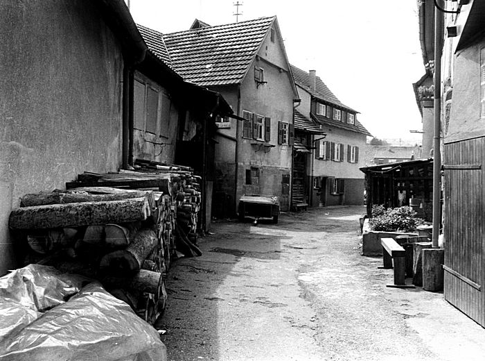 Sommer 1987, Ansicht der rechten Häuserzeile an der Vorderen Seestrasse, kurz vor dem Abriss (vom Strassenzug Im Gässle aus gesehen).