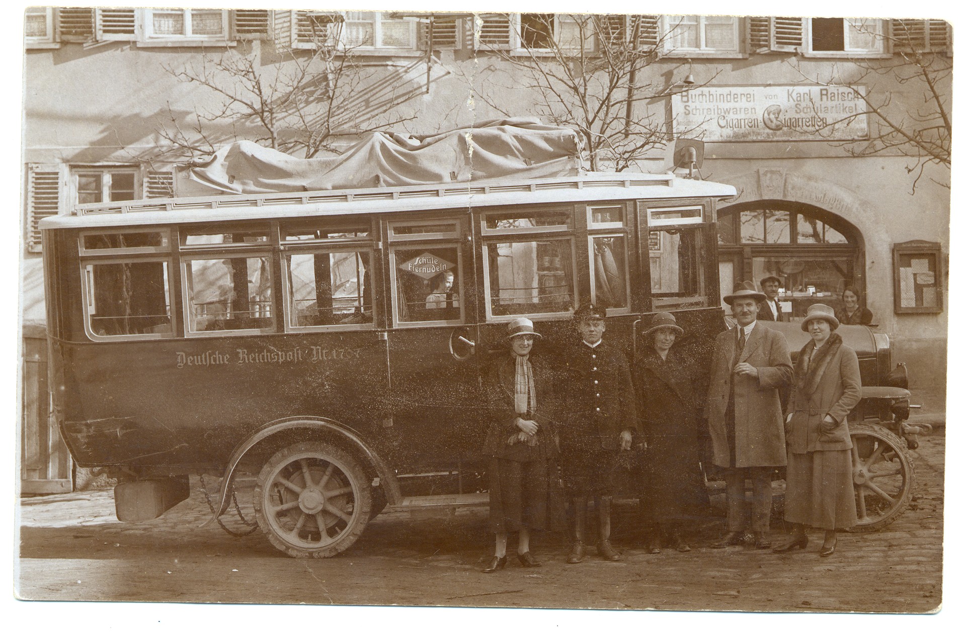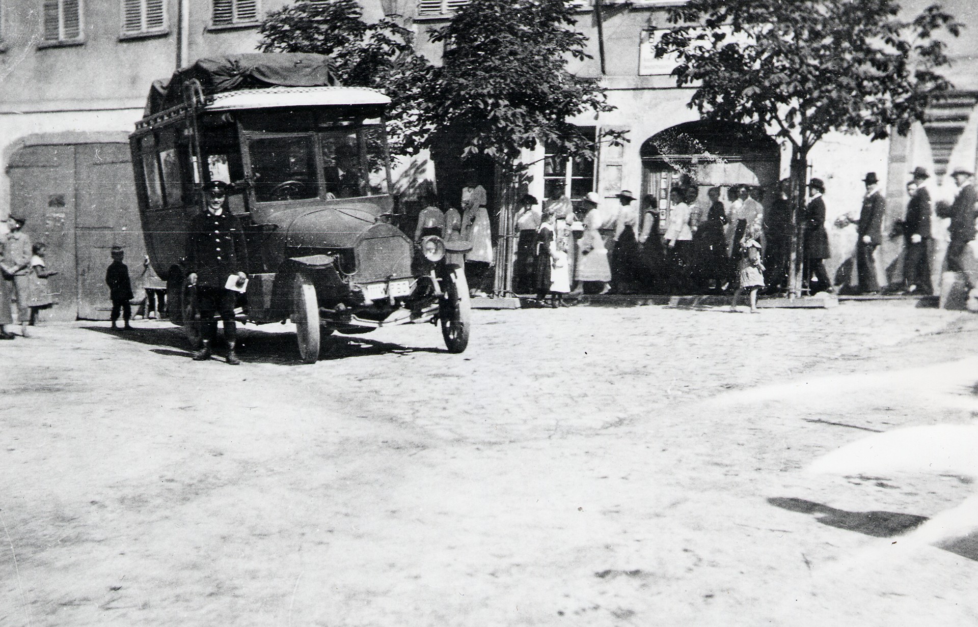 - 1928. Zweites Postauto. Chauffeur von August Herre in Damenbegleitung.