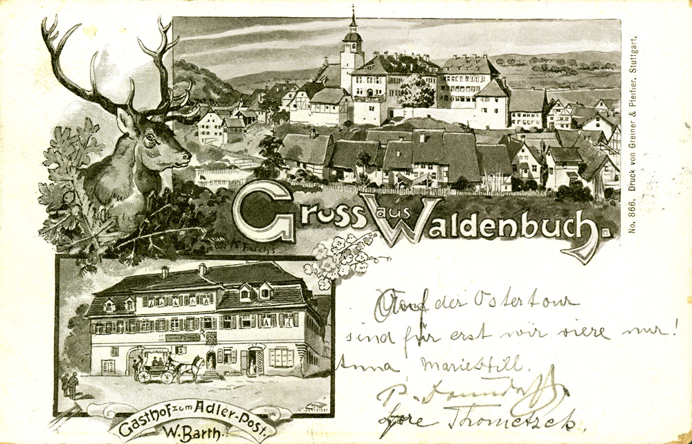 Verschiedene Studentenverbindungen von Tübingen und Hohenheim sowie viele Stuttgarter machten ihre Sonntagsausflüge nach Waldenbuch und kehrten in der Post ein.