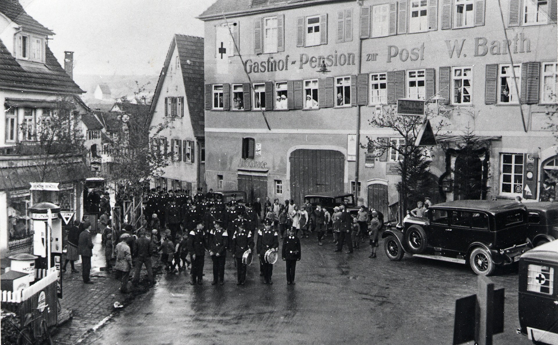 - April 1933. Gasthof Post, Kaufhaus Binder mit Tanksäule, Deutsches Rotes Kreuz, Erstes Sanka.
