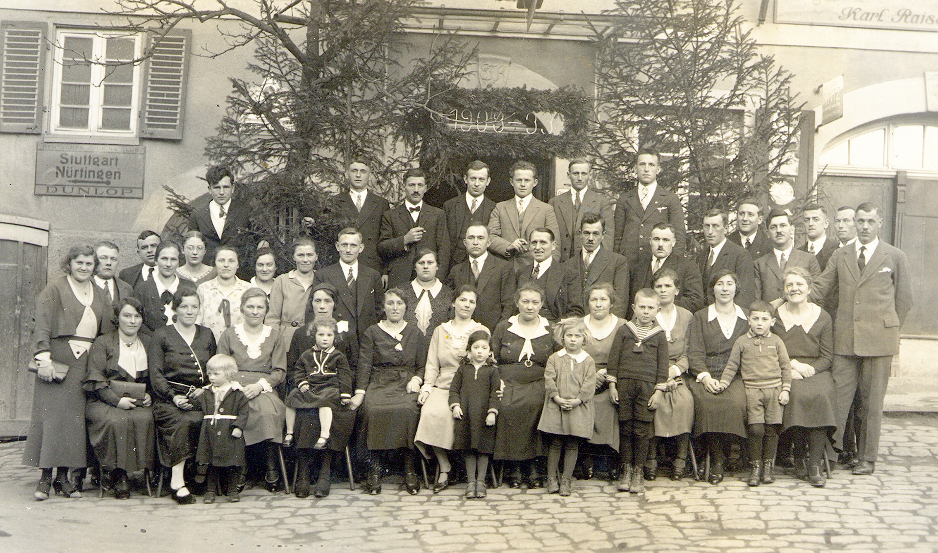 - 1933. Jahrgangsfeier des Jahrgangs 1903 vor der Post, Rechts Laden von Karl Raisch.
