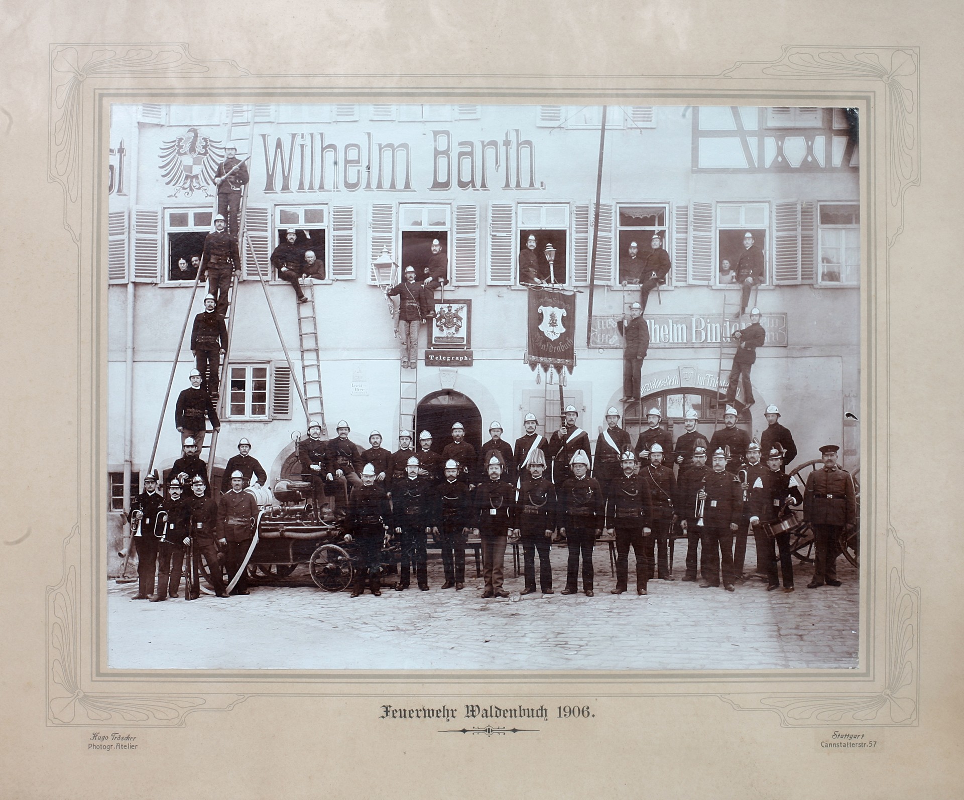 - 1906, Stolze Feuerwehr posiert vor Gasthof zur Post.