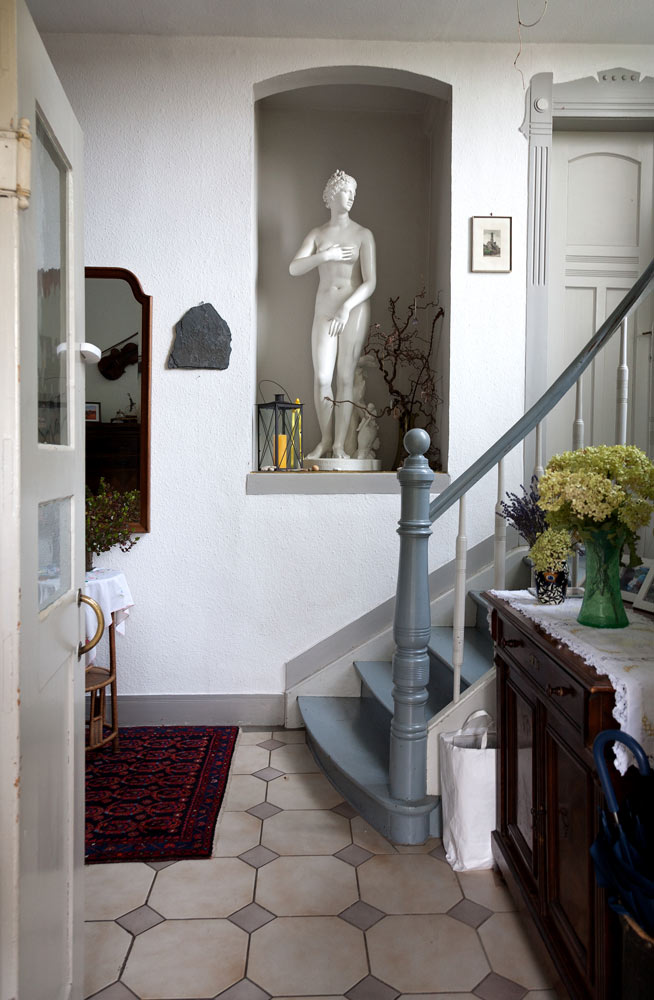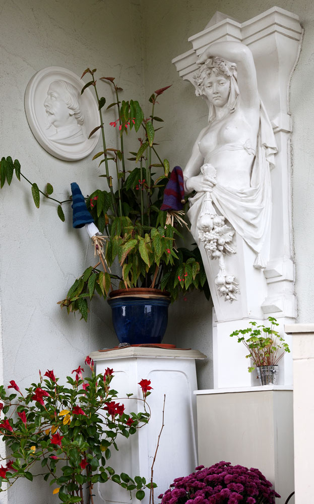 - 2014. Eingangsveranda mit Frauenskulptur und Relief