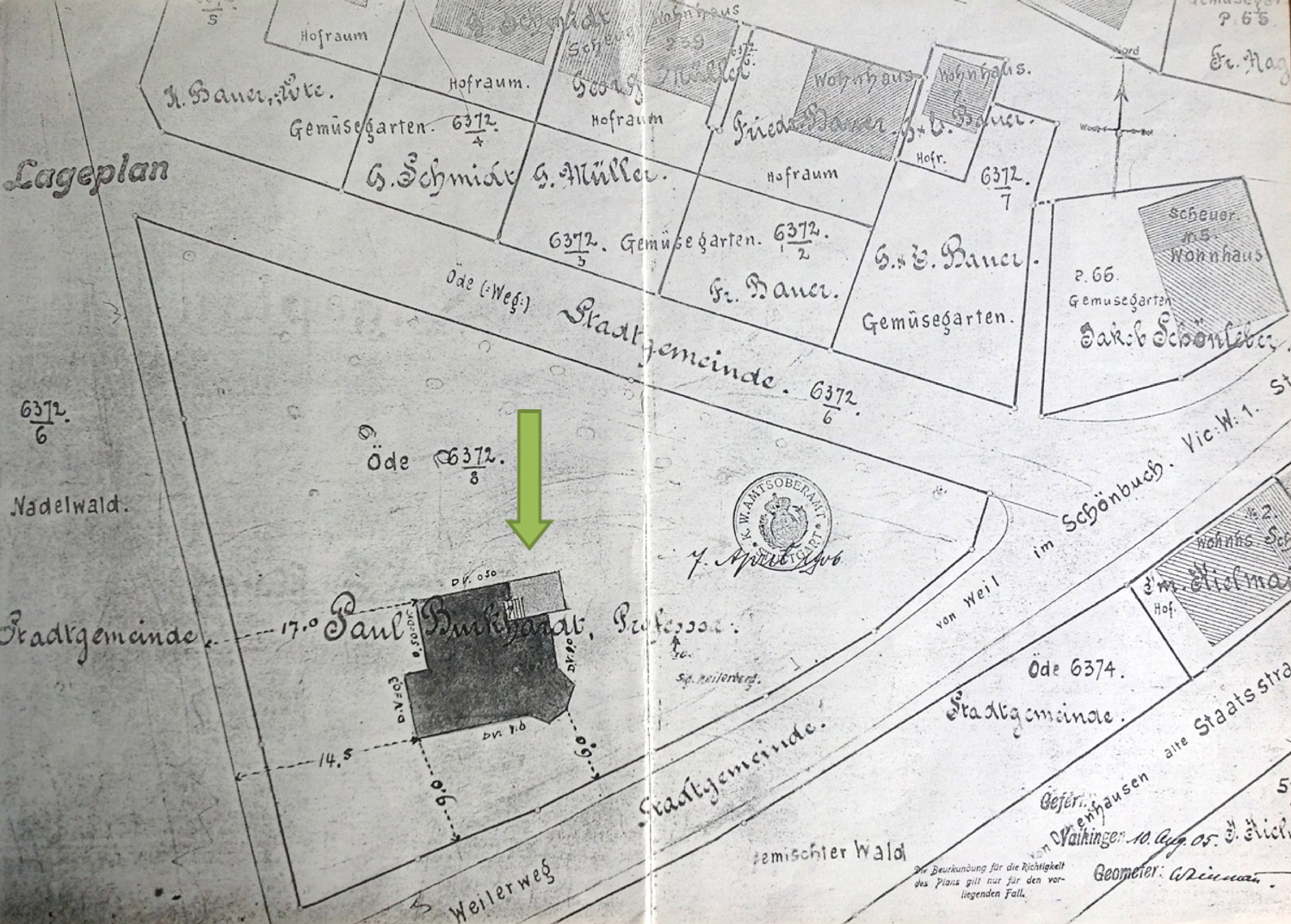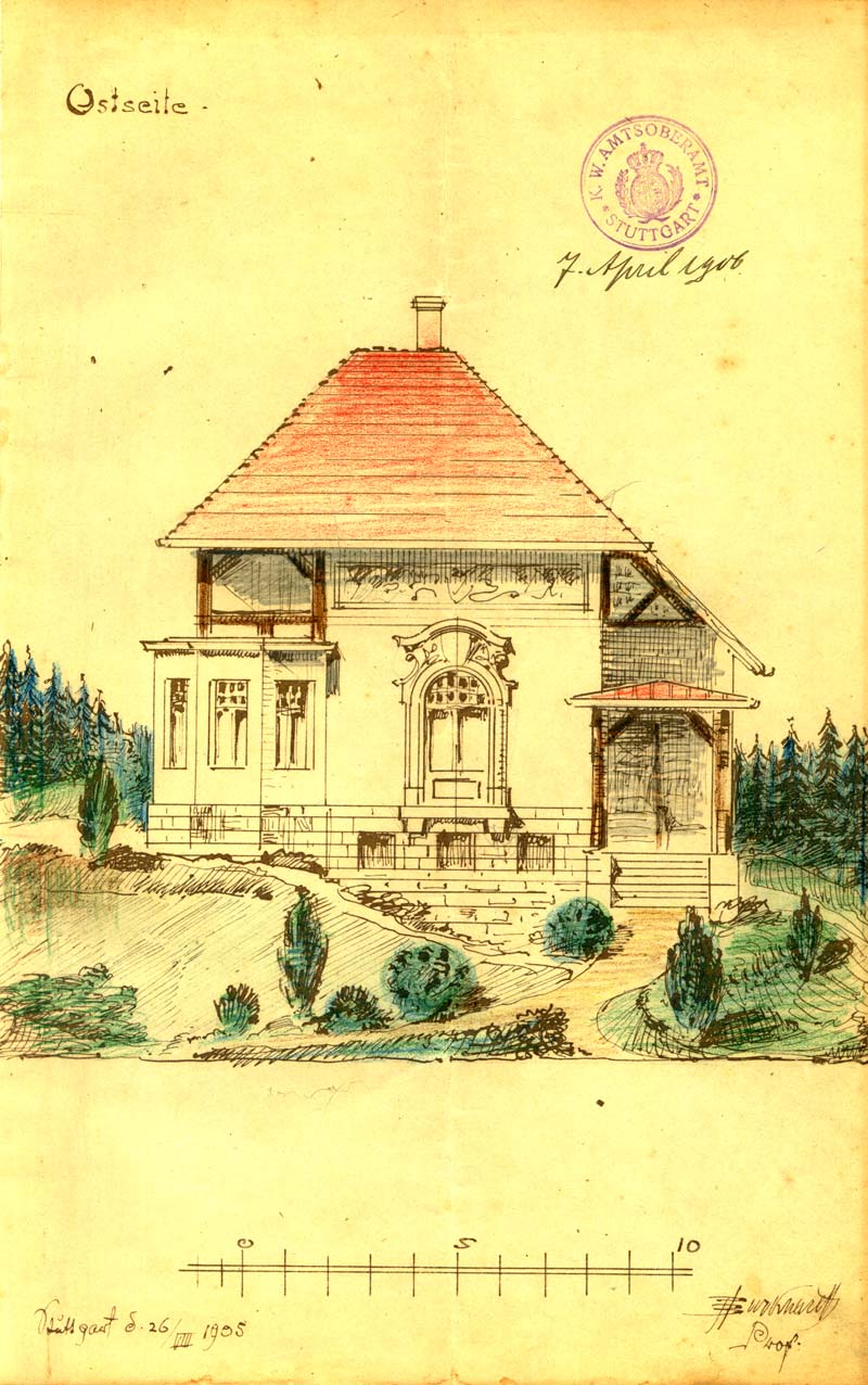 Hoch oben auf dem Weilerberg erhebt sich auf der rechten Strassenseite ein für Waldenbuch ungewöhnliches Haus. Die Villa Burkhardt. Im Volksmund wegen ihrer späteren Besitzer auch “Villa Staub” genannt, wurde das Gebäude 1906 von dem Waldenbucher Architekten Prof. Jakob Paul Burkhardt entworfen und erbaut. Er bewohnte die Villa zusammen mit seiner Frau Elise, geb. Dünger.