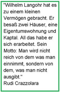 Wilhelm Langohr, geboren 29. Mai 1929 als unehelichtes Kind. Nach dem frühen Tod der Mutter verbrachte er seine Kindheit im Waisenhaus; „mehr Schläge als zu essen“ prägte ihn. 1945, mit 16 Jahren wurde er völlig mittellos aus dem Waisenhaus entlassen. Er erwarb sich Freunde durch seine Zuverlässigkeit, Fleiß und Ehrlichkeit und fand ebenso Unterstützung in persönlichen Dingen. Ohne familiäre Bindung blieb er unabhängig auch in seinen Entscheidungen und äußerst sparsam. Er entwickelte sich in aller Bescheidenheit zum wohlhabenden Bürger in Waldenbuch. Sein Lebensstil orientierte sich daran, was er nicht auszugeben brauchte.