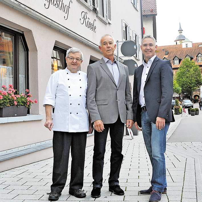 Die Stiftungsräte Gerhard Seeger, Rudolf Crazzolara und Bernd Bauer (v.l.) vor dem Rössle – einem Ort, der im Leben Wilhelm Langohrs eine wichtige Rolle gespielt hat. Foto: Martin Müller