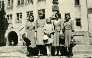 c.a. 1950. Die Schwab Mädchen aus Soroksar/ Batschka mit Freundinnen im Schloßhof. Foto: Theresia Mayer