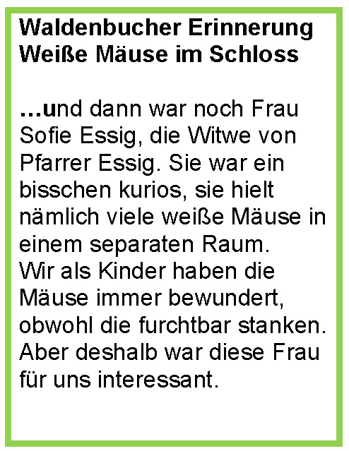 In den Kriegsjahren war das natürlich anders. Anfangs gab es eigentlich alle Lebensmittel, aber später gab es dann die Lebensmittelkarten. Wir Schlossbewohner haben genau wie die Waldenbucher von diesen Rationen gelebt. Sie hatten aber auch alle Freunde unter den Bauern und wir hatten das nicht. Da waren wir wieder Fremde, zumindest die Erwachsenen, für uns Kinder war das anders.