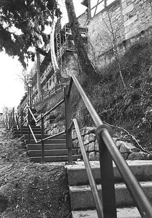 1989. Alter Treppenaufgang von der Grabenstrasse zur Stadtkirche und zum Schloss. Foto: J. KapsSchloss