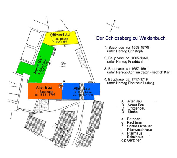 Vereinfachtes Schema der vier Bauphasen des Waldenbucher Schlosses auf der Grundlage des Plans von Otto Springer aus dem Jahre 1912. Grafik: Susanne Schmidt